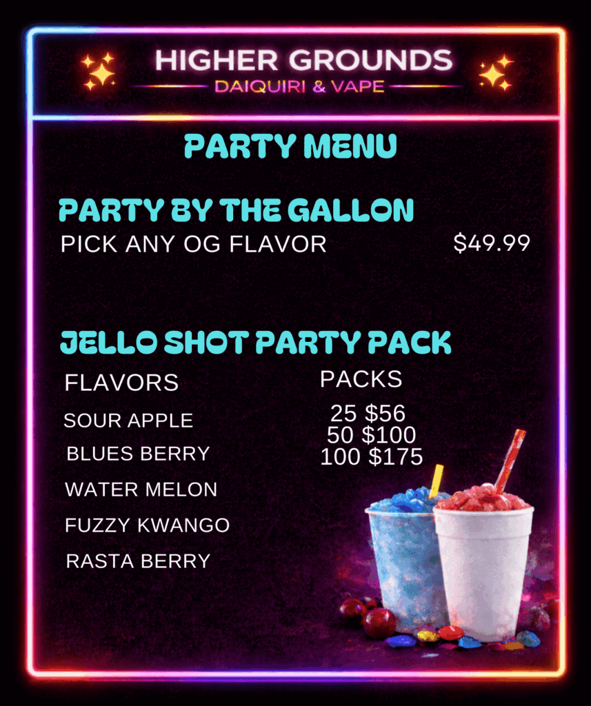 - Customizable Party Packs: Take the vibe home with our gallon-sized party specials and signature jello shots.