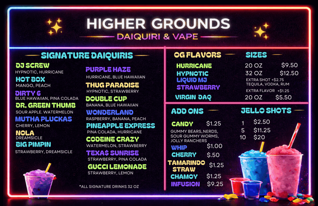 From signature daiquiris to party packs and classic favorites - discover the taste, vibe, and experience that makes Higher Grounds special.